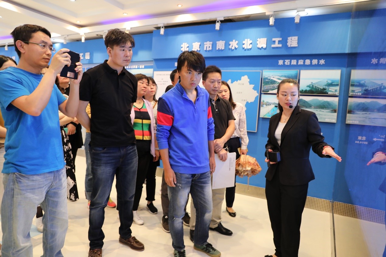 初夏時節,群芳吐艷、桃紅柳綠。中材科技總部的黨員干部職工自駕車從總部辦公地點出發,來到位北四環旁的南水北調中線工程終點的團城湖實地參觀。停好車后,大家井然有序排列整齊,在講解員的引導下來到南水北調展覽館。在展室內,大家認真聆聽講解,講解員用一組組數據全面展示了南水北調工程的歷史沿革,并重點講解了南水北調中線工程特別是北京段的建設情況。中線工程全程1276公里,起自長江支流漢江的丹江口水庫,沿京廣鐵路西側北上,跨越河南、河北、天津、北京四省市,終點為北京的團城湖。規劃分兩期實施,一期工程年均調水83.4億立方米。其中北京段工程全長80公里。通水后,北京年均接收丹江口水庫來水凈水量10.5億立方米,北京水資源嚴重短缺形勢得到了有效緩解。如今北京市飲用水50%以上來自南水北調工程。在聆聽講解的過程中,黨員們還針對南水北調工程投資、水價構成、管理體制、工程建設規劃、工程建設難點等問題與管理處工作人員進行了交流。黨員們不僅被一組組的數據、一個個實例打動,更對南水北調背后的艱辛的付出感動,同時也油然而生對這個偉大的工程的贊嘆之情。